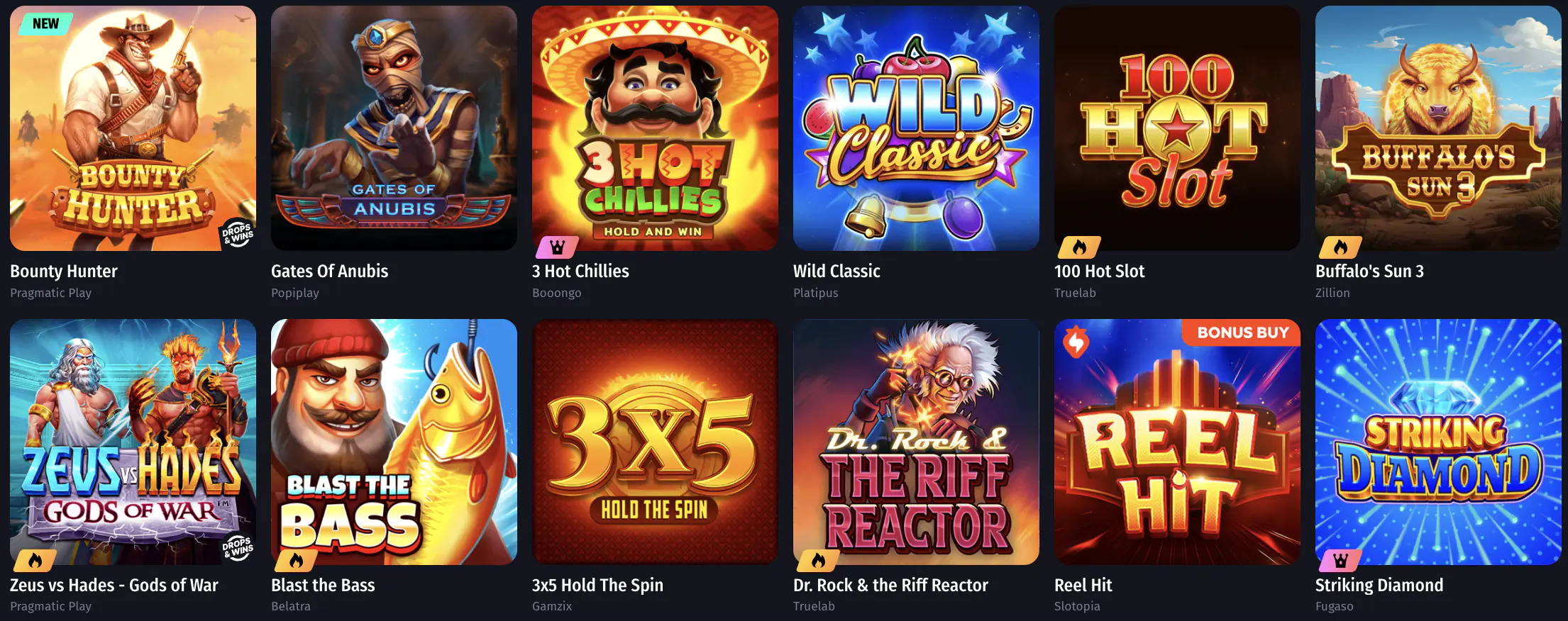 We suggest the most popular games, such as Hot Devil Slot, Big Bass Bonaza, and Gates of Anubis. There’s also a convenient search option; simply type in the game you want to play and we’ll show you a link to it. You’ll also find a link to other similar casino games.